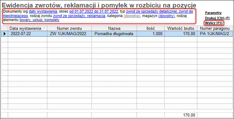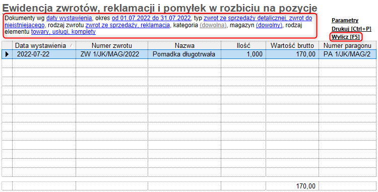 Aby wyliczyć zestawienie prezentujące Ewidencję zwrotów, reklamacji i pomyłek w rozbiciu na pozycje (z wartościami netto i brutto oraz dokumentem, do którego dokonano zwrotu), należy: