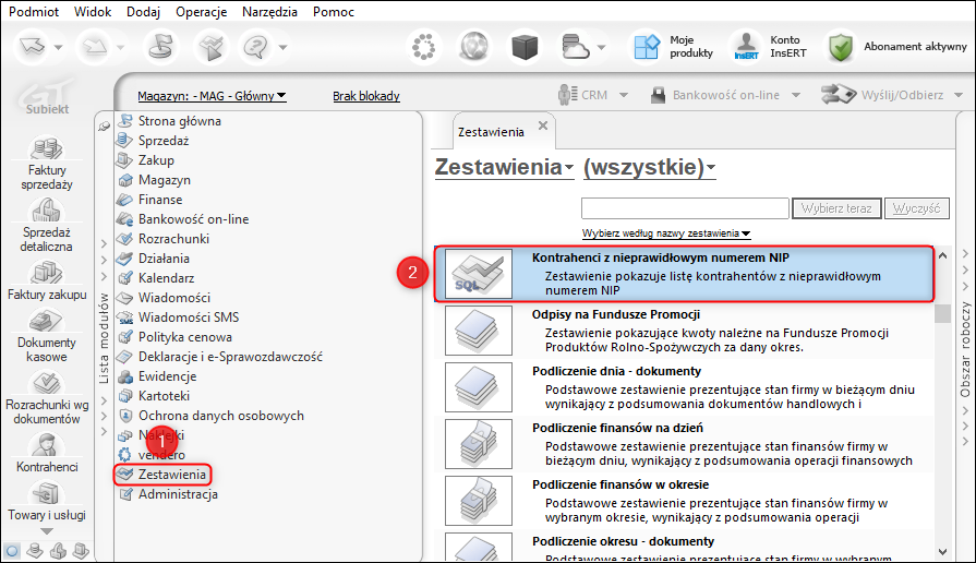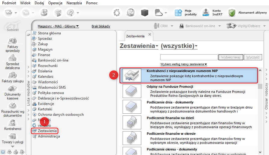 1. Przejść do modułu Zestawienia i wybrać pozycję Kontrahenci z nieprawidłowym numerem NIP.
