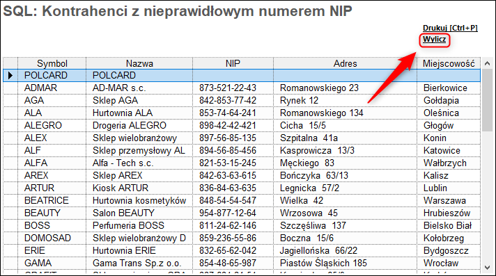 Aby wyliczyć zestawienie prezentujące kontrahentów z nieprawidłowym numerem NIP (razem z ich symbolem, nazwą i danymi adresowymi), należy: