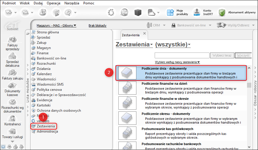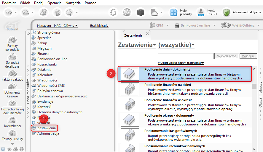 Subiekt GT – Jak wyliczyć zestawienie prezentujące podliczenie dnia wynikające z podsumowania dokumentów handlowych i magazynowych?