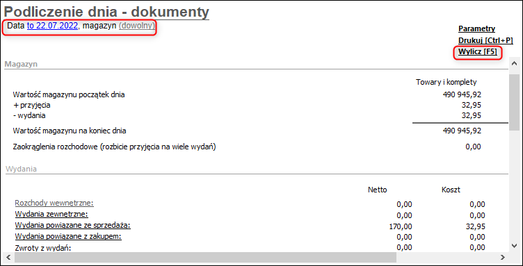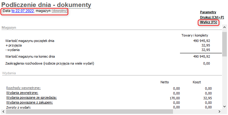 Aby wyliczyć zestawienie prezentujące podliczenie dnia wynikające z podsumowania dokumentów handlowych i magazynowych (wartości magazynu na początku i końcu dnia, wykonane wydania i przyjęcia), należy: