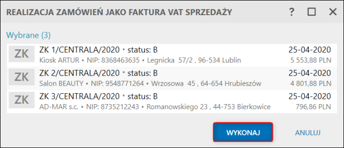2. Przycisk Wykonaj rozpocznie realizację zamówień.