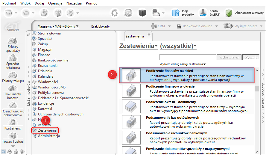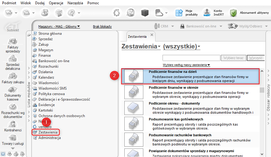 Subiekt GT – Jak wyliczyć zestawienie prezentujące stan finansów firmy w danym dniu?