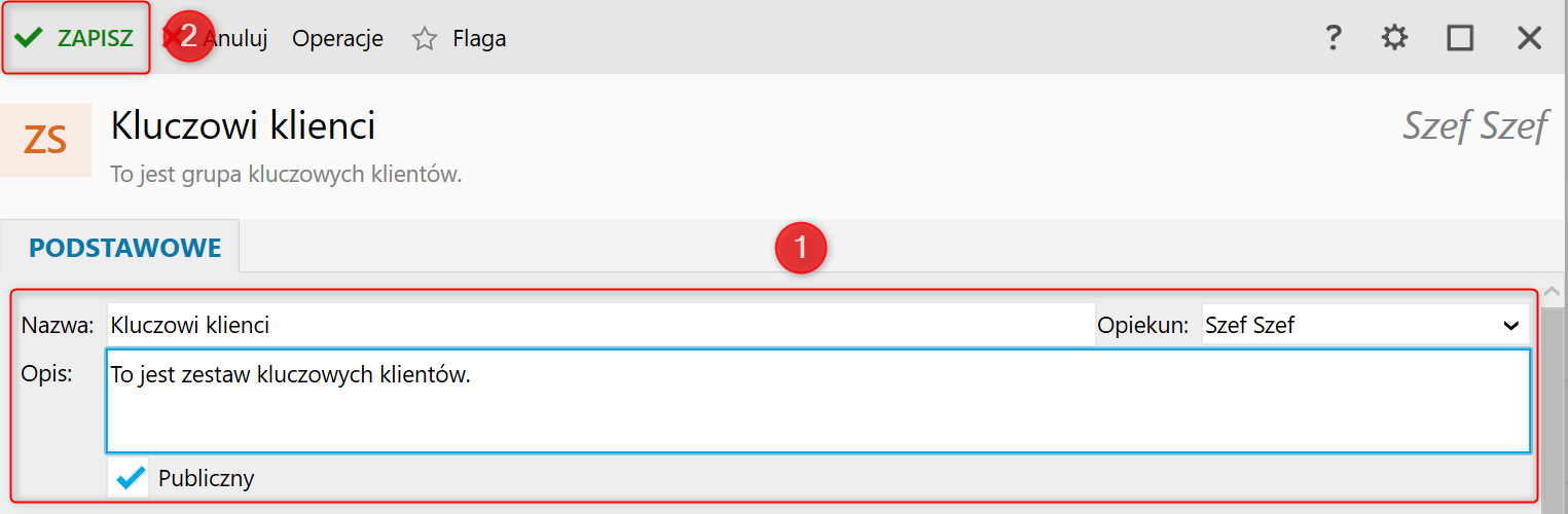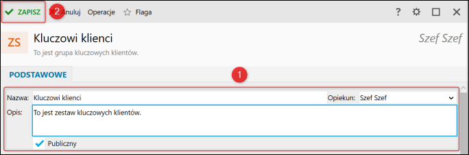 2. W oknie, które się wyświetli wprowadzić nazwę tworzonego zestawu klientów, wybrać opiekuna oraz zdecydować czy zestaw jest publiczny (publiczny, czyli taki, do którego dostęp mają wszyscy użytkownicy programu). Opcjonalnie można wprowadzić też opis zestawu. Po wprowadzeniu potrzebnych danych zestaw zapisać.