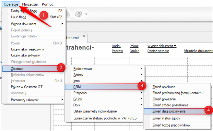 2. Wybrać z górnego menu Operacje – Zbiorcze – CRM – Zmień datę pozyskania klienta.