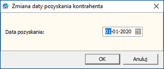3. W oknie Zmiany daty pozyskania kontrahenta wprowadzić datę ręcznie lub wybrać z dostępnego dodatku, a zmiany zatwierdzić wybierając OK.