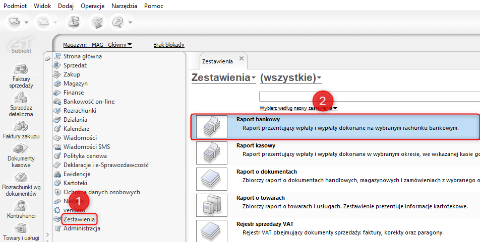 1. Przejść do modułu Zestawienia i wybrać pozycję Raport bankowy.