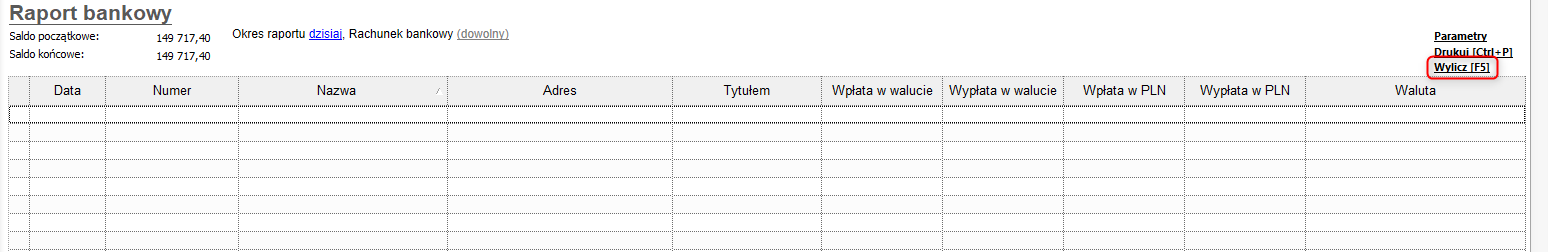 Aby wyliczyć zestawienie prezentujące wpłaty i wypłaty dokonane na wybranym rachunku bankowym we wskazanym okresie (raport bankowy), należy:​