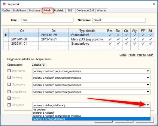 1. Przejść do kartoteki wspólnika (Kartoteki – Wspólnicy), a następnie na zakładce Składki zmienić parametr odpowiadający za pobieranie wartości dla składek zdrowotnych na Pobieraj z definicji deklaracji.