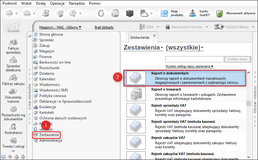 1. Przejść do modułu Zestawienia i wybrać pozycję Raport o dokumentach.