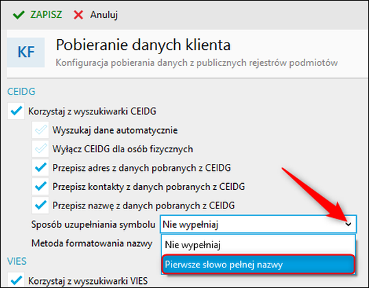 2. Przy opcjach wyszukiwarki CEIDG wybrać z listy rozwijanej uzupełnianie symbolu jako Pierwsze słowo pełnej nazwy i zatwierdzić zmiany przyciskiem Zapisz.