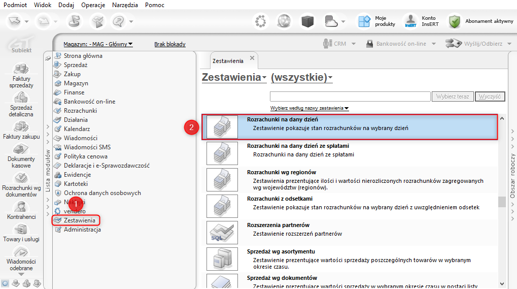 1. Przejść do modułu Zestawienia i wybrać Rozrachunki na dany dzień.