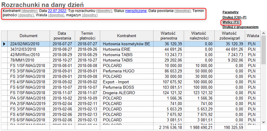 Aby wyliczyć zestawienie prezentujące stan rozrachunków na wybrany dzień (wartość pierwotną oraz pozostałą rozrachunku, kontrahenta i dokument), należy: