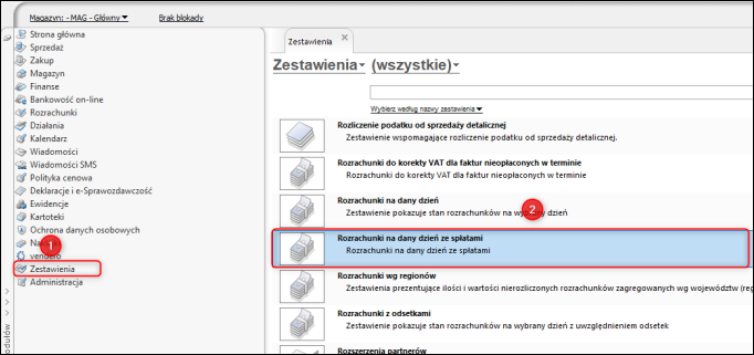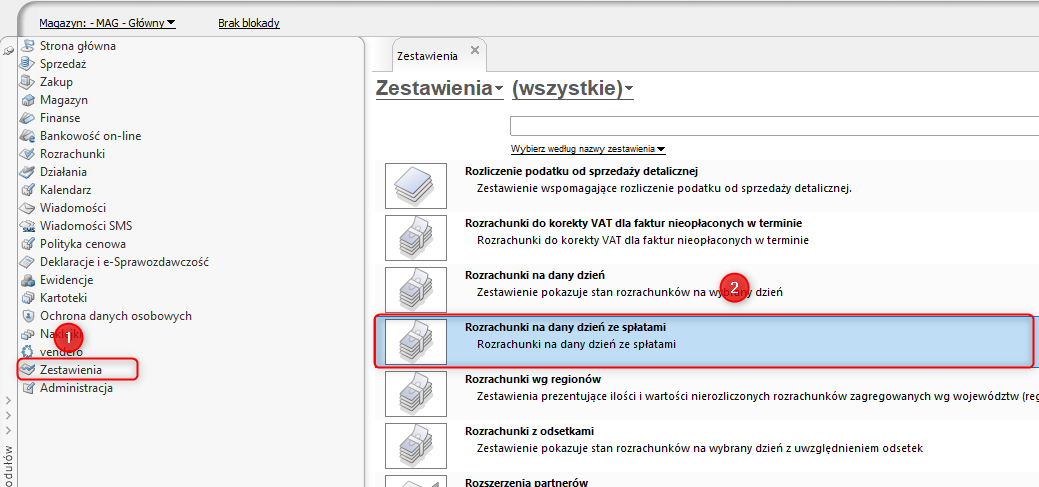 1. Przejść do modułu Zestawienia i w​ybrać Rozrachunki na dany dzień ze spłatami.