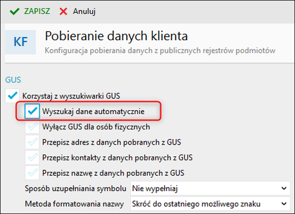 Niezakreślenie pola Wyszukaj dane automatycznie wymusi na użytkowniku wprowadzanie danych interesującego go klienta do wyszukiwarki GUS. Dla nowych podmiotów jest on zaznaczony.