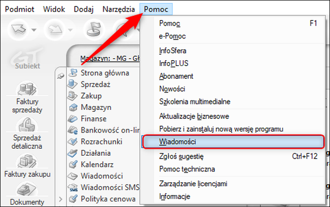 3. Do wiadomości można przejść z górnego menu Pomoc lub z paska stanu u dołu ekranu.