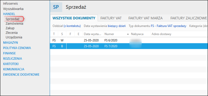 1. Przejść do modułu Sprzedaż – Faktury sprzedaży i zaznaczyć pozycję do skorygowania.