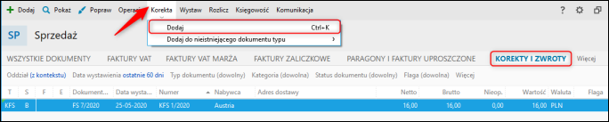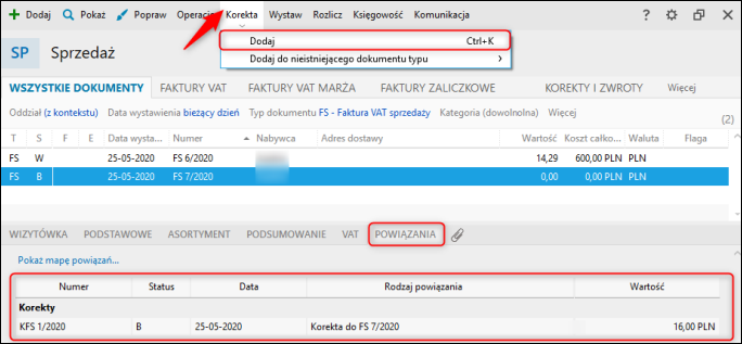 2. Wybrać na dokumencie FS lub na istniejącej korekcie z górnego menu Korekta – Dodaj.