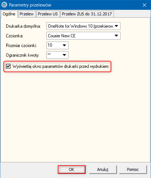 2. W oknie, które się wyświetli włączyć opcję Wyświetlaj okno parametrów drukarki przed wydrukiem. Zmiany zapisać przyciskiem OK.