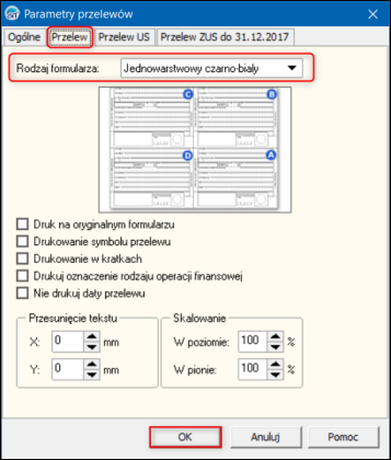2. W oknie, które się wyświetli przejść na zakładkę Przelew i wybrać Rodzaj formularza jako Jednowarstwowy czarno-biały. Na zdjęciu poniżej jest widoczny przykładowy wydruk takiego blankietu. Zmiany zapisać przyciskiem OK.