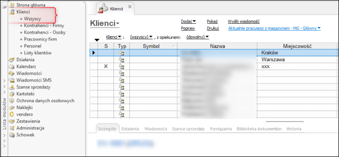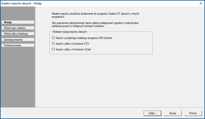 Gestor GT oferuje możliwość zaimportowania danych klientów z programu MS Outlook, z plików CSV oraz VCard. Aby uruchomić kreator importu, należy przejść do modułu Klienci – Wszyscy.