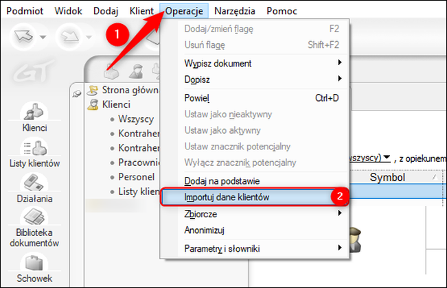 Następnie wybrać z górnego menu Operacje – Importuj dane klientów.