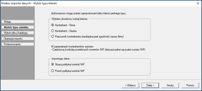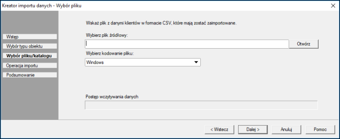 Pierwszym krokiem kreatora jest Wstęp, gdzie należy określić źródło danych klientów.