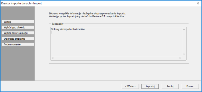 Operacja importu wyświetla szczegóły operacji. Aby rozpocząć proces pobierania, należy wybrać Importuj.