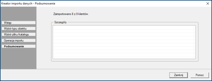 Podsumowanie zawiera wynik operacji importu. Jeżeli w oknie nie są widoczne błędy, można wybrać przycisk Zamknij, aby zakończyć działanie kreatora.