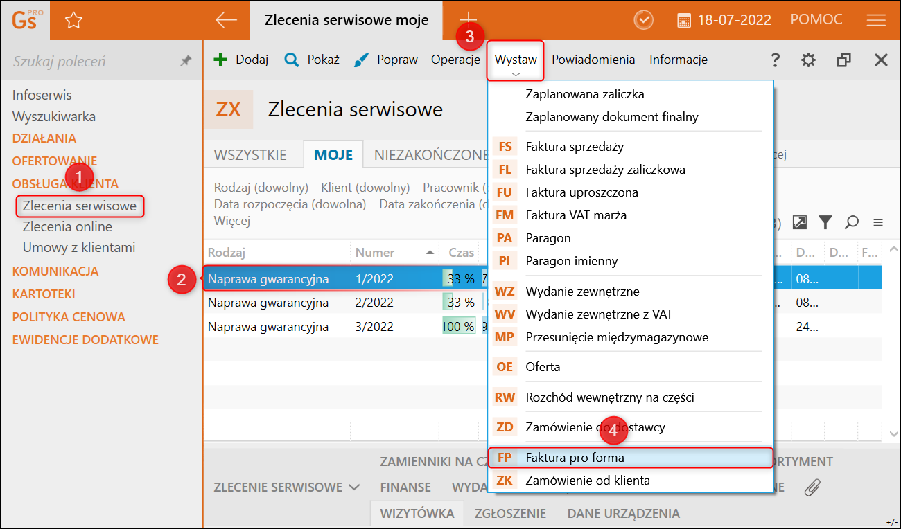 1. Przejść do modułu Obsługa klienta – Zlecenia serwisowe, zaznaczyć zlecenie i z górnego menu wybrać Wystaw – Faktura pro forma.