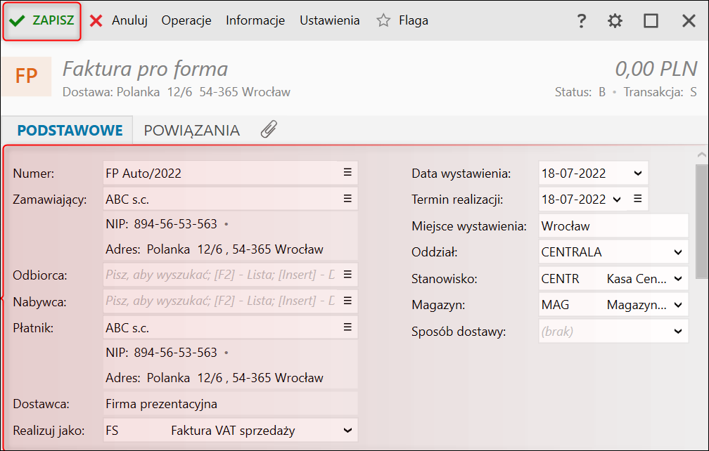 2. Do dokumentu zostaną przeniesione dane ze zlecenia z możliwością edycji, a następnie zapisania.