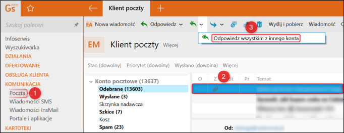 1. Przejść do modułu Komunikacja – Poczta, zaznaczyć wybraną wiadomość, a następnie z górnego menu wybrać opcję Odpowiedz z innego konta, wskazać konto pocztowe, z którego ma zostać wysłana odpowiedź i zatwierdzić OK