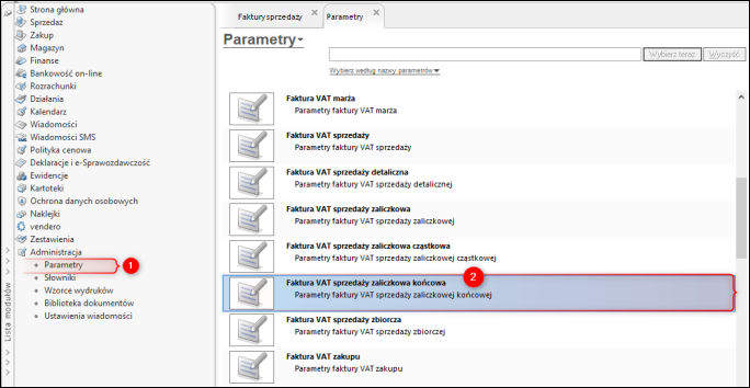 1. Przejść do modułu Parametry – Faktura VAT sprzedaży zaliczkowa końcowa.