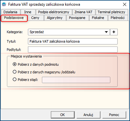 2. W oknie Faktura VAT sprzedaży zaliczkowa końcowa na zakładce Podstawowe wybrać źródło informacji o miejscu wystawienia. Do wyboru są 3 możliwości, takie jak: