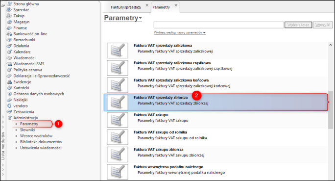 1. Przejść do modułu Parametry – Faktura VAT sprzedaży zbiorcza.