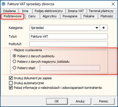 2. W oknie Faktura VAT sprzedaży zbiorcza na zakładce Podstawowe wybrać źródło informacji o miejscu wystawienia. Do wyboru są 3 możliwości, takie jak: