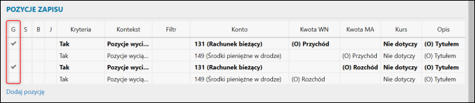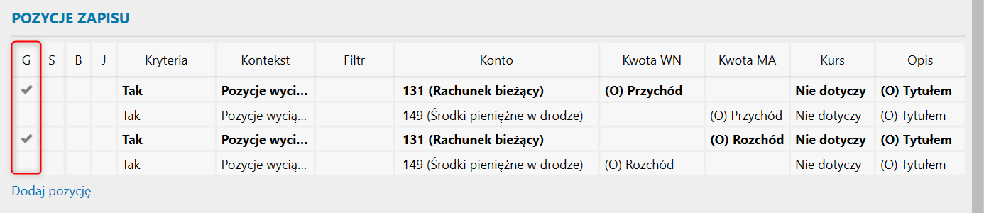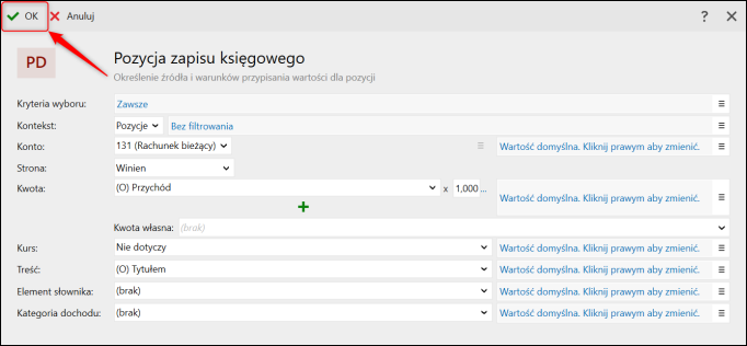 9. W analogiczny sposób należy dodać pozycję odpowiedzialną za dekretację kwoty (O) Rozchodu na Koncie 131 (Rachunek bieżący) po Stronie Ma.