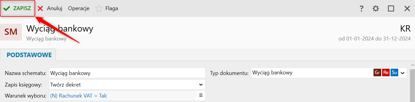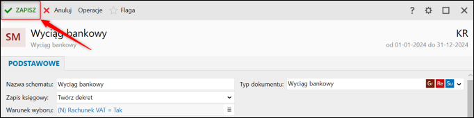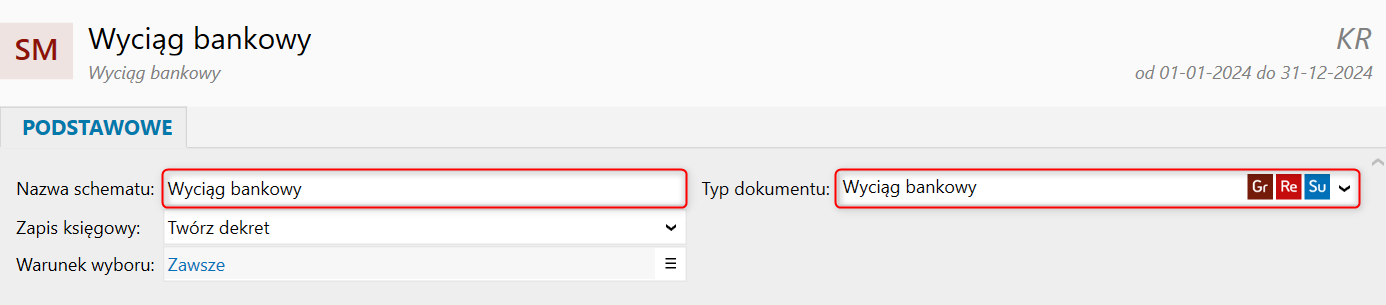 2. W sekcji Podstawowe wprowadzić nazwę schematu, a jako typ dokumentu wskazać Wyciąg bankowy.