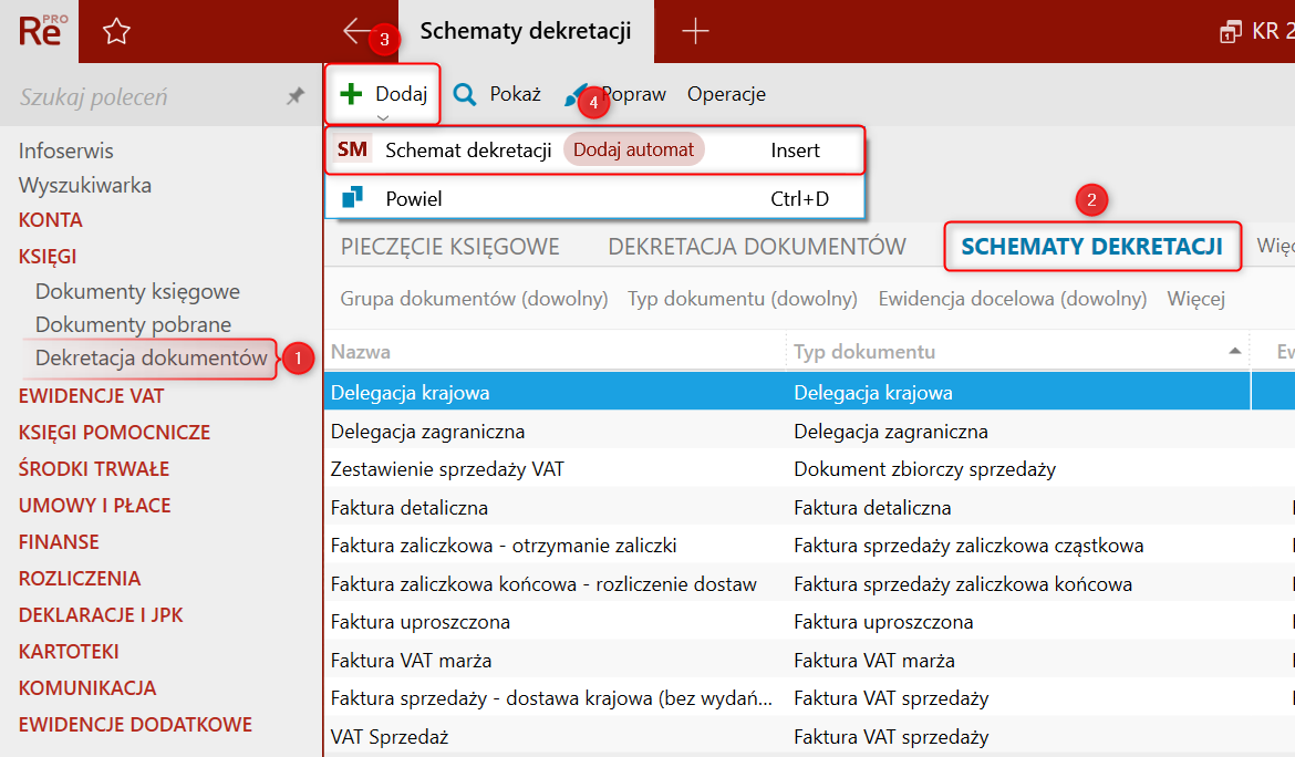 1. Przejść do modułu Dekretacja dokumentów na zakładkę Schematy dekretacji i z górnego menu Dodaj wybrać Schemat dekretacji.