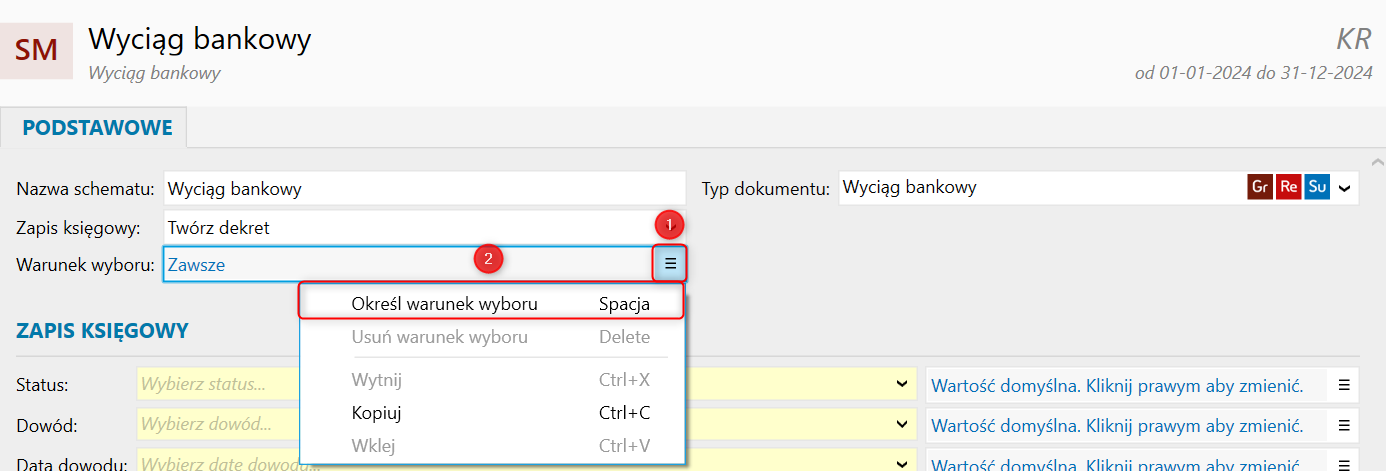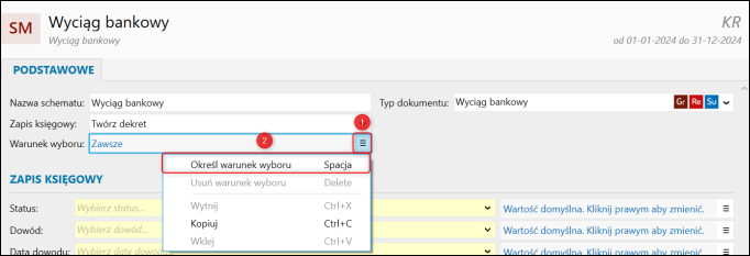 3. Warunek wyboru określa kryterium i moment wykorzystania schematu. Warunek ten dotyczy tylko tych obrazów księgowych (dokumentów do dekretacji), które posiadają przypisany schemat dekretacji (auto). Oznacza to, że do takich obrazów księgowych zastosowany zostanie pierwszy znaleziony schemat wg określonej kolejności i spełniający warunek określony w polu Warunek wyboru. Aby to zrobić, należy kliknąć ≡ i wybrać Określ warunek wyboru.