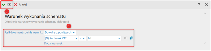 4. Schemat będzie dotyczyć wyciągów dla rachunku VAT, wobec czego warunek należy ustawić na (N) Rachunek VAT = Tak. Zatwierdzić przyciskiem OK.