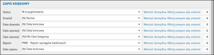 5. Sekcja Zapis księgowy służy do określenia, w jaki sposób program ma automatycznie wypełniać pola widoczne jak na zrzucie poniżej. Pełen opis funkcji znajduje się tutaj.