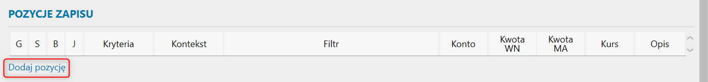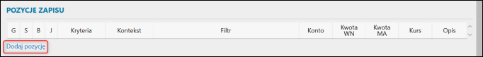 6. Pozycje zapisu służą do wskazania, na jakie konta mają zostać zaksięgowane kwoty z dokumentu. W pierwszej kolejności zostanie dodane konto sprzedawcy. W celu dodania pozycji należy kliknąć Dodaj pozycję.