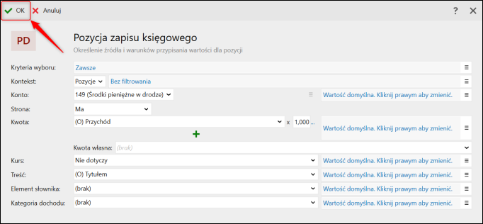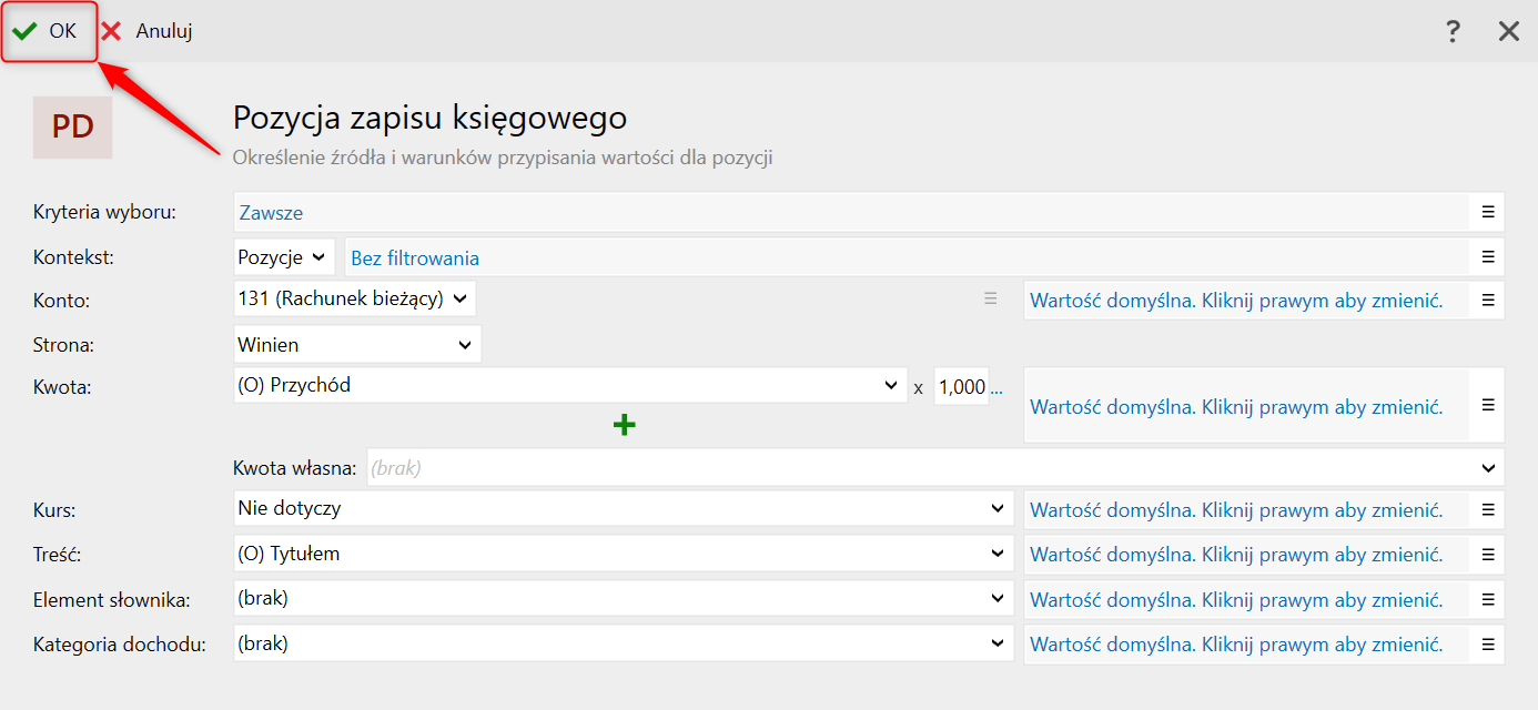 7. W pierwszej kolejności dodane zostaną pozycje dotyczące przychodu na koncie rachunku. W oknie Pozycja zapisu księgowego został wybrany: