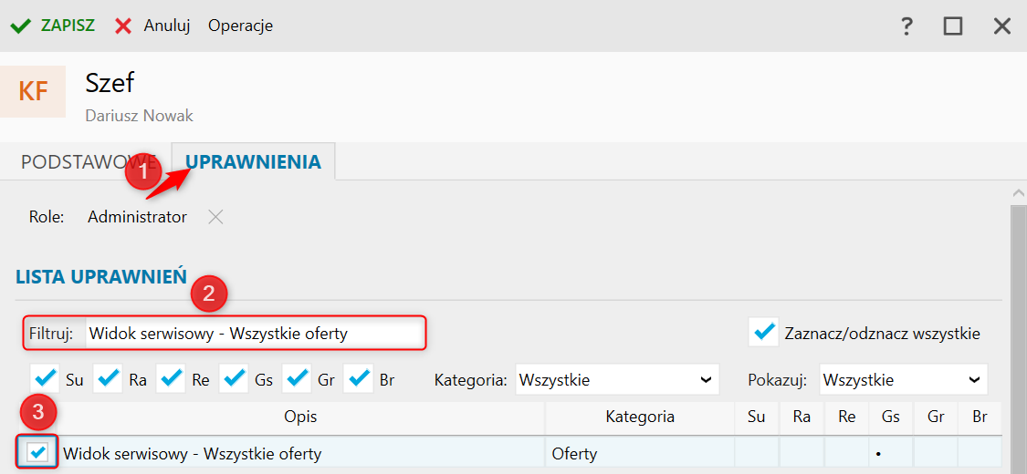 2. Przejść na zakładkę Uprawnienia, w Filtruj wpisać Widok serwisowy – Wszystkie oferty, a następnie odznaczyć znacznik przy wybranym uprawnieniu. Przycisk Zapisz zatwierdzi wprowadzone zmiany.