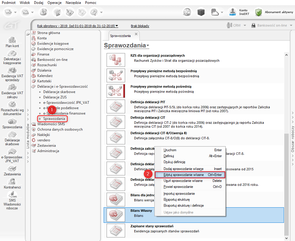 1. Z listy modułów wybrać Deklaracje i e-Sprawozdania – Sprawozdania, kliknąć zestawienie własne Prawym Przyciskiem Myszy i wybrać opcję Edytuj sprawozdanie własne.