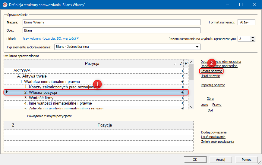 Własne pozycje w sprawozdaniach finansowych, takich jak Bilans, czy Rachunek zysków i strat wymagają przypisania ich do odpowiednich pozycji danego sprawozdania. Jest to konieczne, aby plik, który jest wysyłany do KRS lub KAS, był wygenerowany w sposób prawidłowy i zawierał wyliczenia własnych pozycji. W tym celu należy: