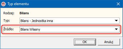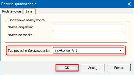 3. Za zakładce Inne wybrać odpowiedni Typ pozycji e-Sprawozdania, czyli miejsce pozycji w podstawowej strukturze danego dokumentu. Zmiany zapisać przyciskiem OK.