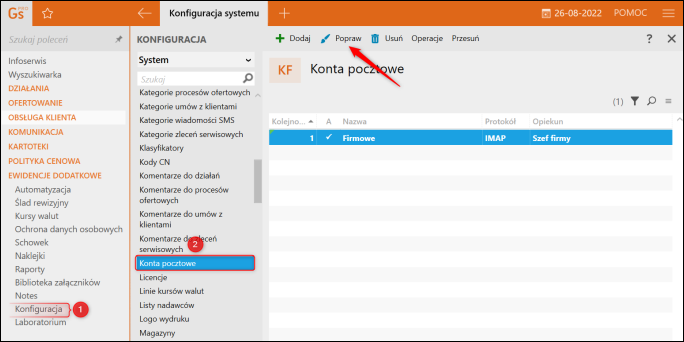 1. Przejść do modułu Ewidencje dodatkowe – Konfiguracja – Konta pocztowe i poprawić wybrane konto pocztowe.