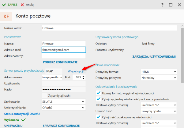 2. W sekcji Serwer poczty przychodzącej IMAP wybrać Więcej opcji.